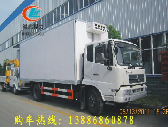 東風(fēng)天錦冷藏車:平頂排半駕駛室可翻轉(zhuǎn),動轉(zhuǎn),排氣制動,900-16輪胎,康明斯170馬力發(fā)動機,6檔變速箱DF6S900,9噸后橋,廂長6000*2250*2300